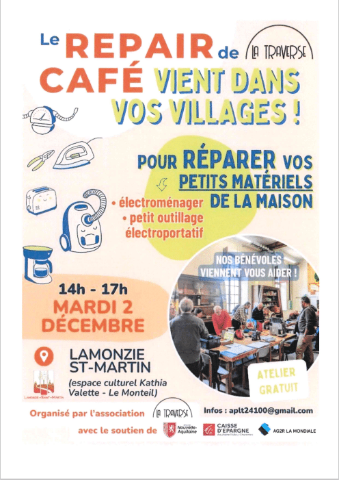 A l'initiative de La Traverse de Bergerac, le Repair Café itinérant permet d'aider ceux qui le souhaitent à réparer des objets du quotidien (cafetière, grille pain ......) le premier rdv est le 2 décembre à l'Espace Socio Culturel Kathia Valette !